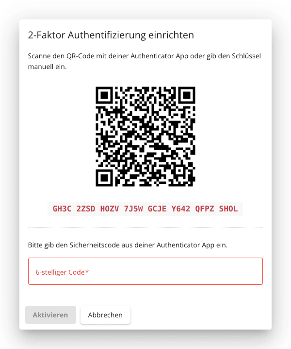 - A QR code will appear - scan it with your authenticator app. (Alternatively, you can manually enter the displayed key.)
