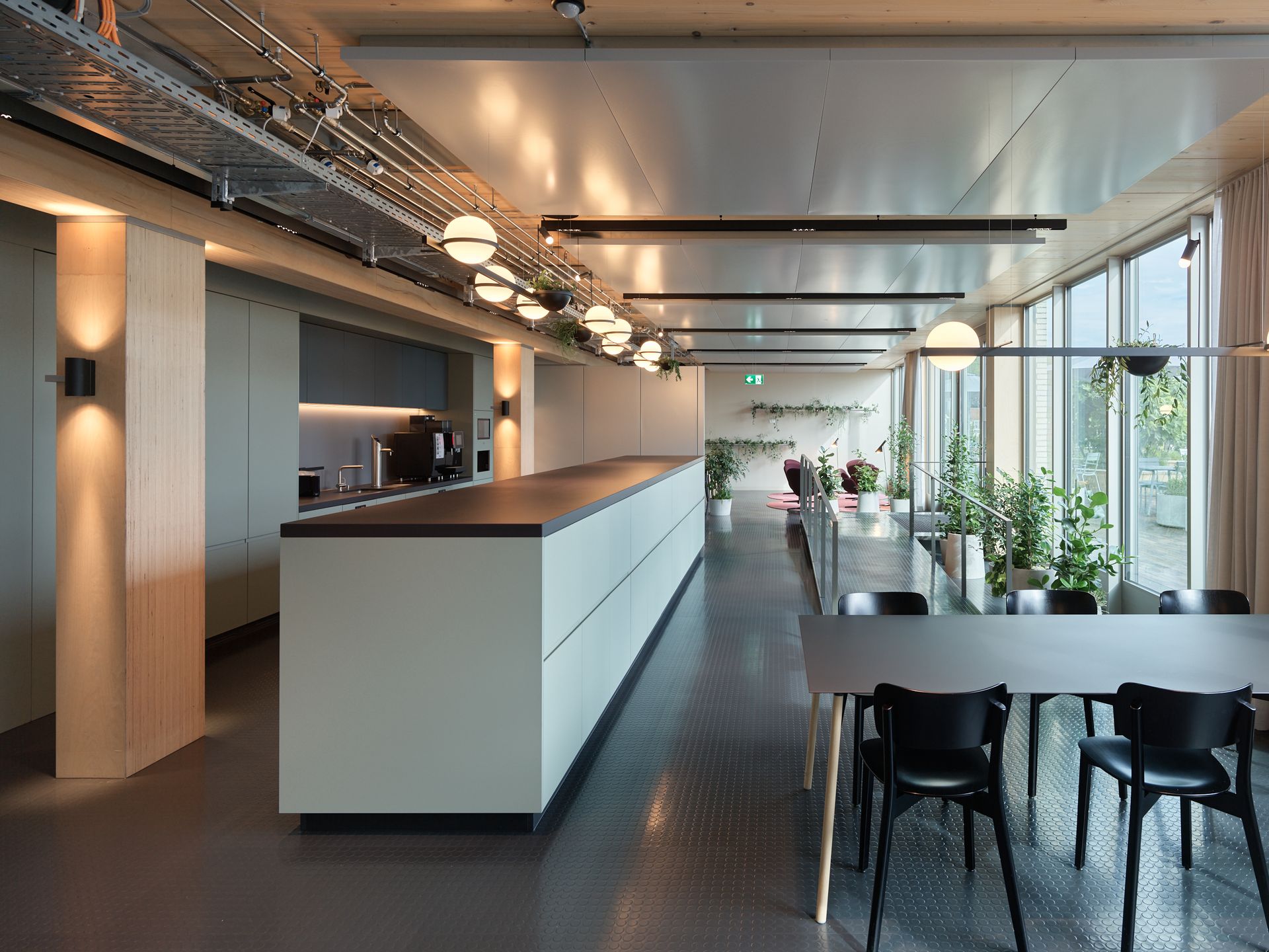 In the double-height halls, flexible lighting groups enable various scenarios – from focused project work to creative settings. The reception area feels open and welcoming, while the spacious boulevard, with its varied lighting, invites visitors to linger and connect.