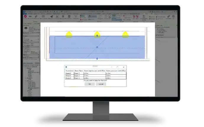 In projects, the room elements are often not raised up to the physical ceiling of the room. In this case, the luminaires on the ceiling are not included in the calculation. With this tool, the room elements are automatically adjusted to the ceiling. The adjusted heights are displayed to the user in a dialogue for checking purposes.
