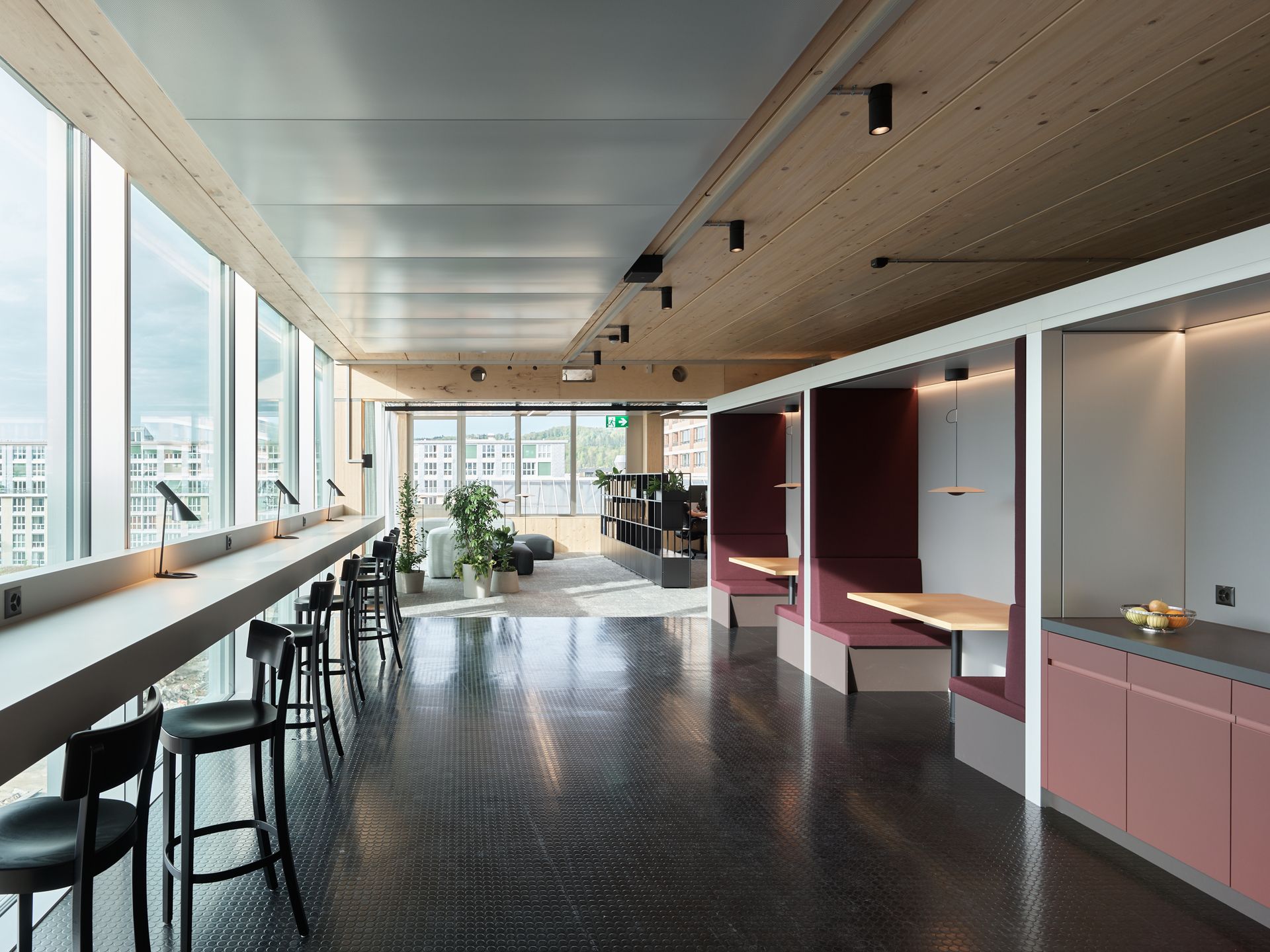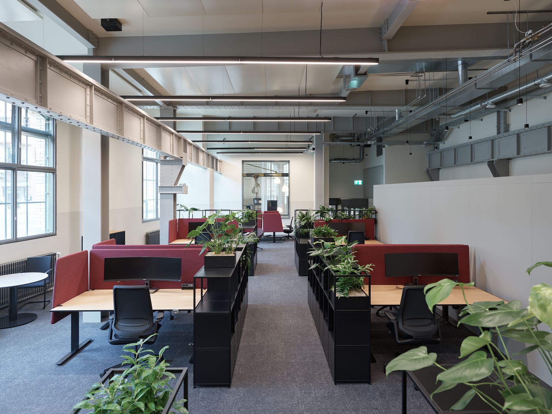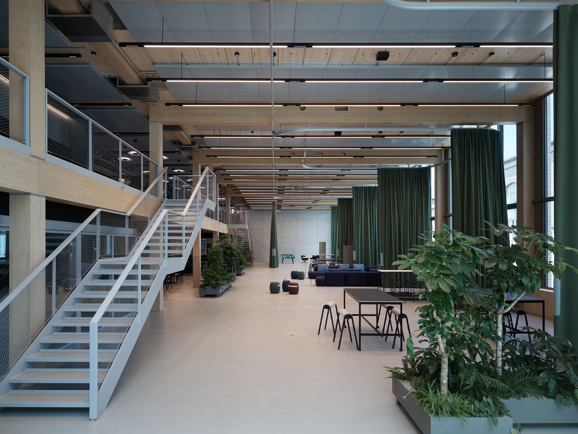 In the double-height halls, flexible lighting groups enable various scenarios – from focused project work to creative settings. The reception area feels open and welcoming, while the spacious boulevard, with its varied lighting, invites visitors to linger and connect.